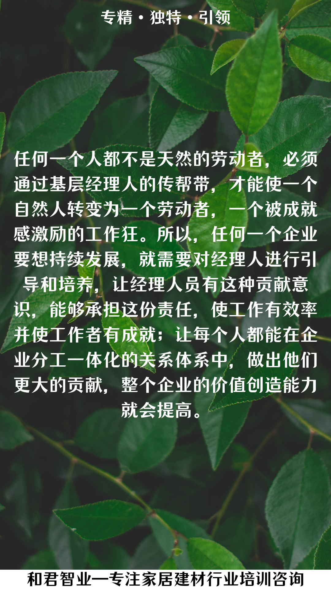 北京和君智業(yè)教育科技有限公司總經(jīng)理 2023中國百強(qiáng)講師 大商公司化運(yùn)營專業(yè)顧問 資深實戰(zhàn)派講師 戰(zhàn)略營銷語錄:提高企業(yè)價值創(chuàng)造能力!任何一個人都不是天然的勞動者,必須通過基層經(jīng)理人的傳幫帶,才能使一個自然人轉(zhuǎn)變?yōu)橐粋€勞動者,一個被成就感激勵的工作狂。所以,任何一個企業(yè)要想持續(xù)發(fā)展,就需要對經(jīng)理人進(jìn)行引導(dǎo)和培養(yǎng),讓經(jīng)理人員有種貢獻(xiàn)意識,能夠承擔(dān)這份責(zé)任,使工作有效率并使工作者有成就;讓每個人都能在企業(yè)分工一體化的關(guān)系體系中,做出他們更大的貢獻(xiàn),整個企業(yè)的價值創(chuàng)造能力就會提高。