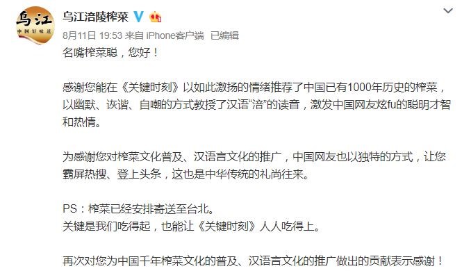 子淳也一直關(guān)注灣灣,兩岸統(tǒng)一是潮流。 大陸吃不起茶葉蛋,買不起榨菜的鬧劇,只能說某些帶毒分子,中毒太深,入戲太足,蚍蜉撼大樹,可笑不自量! 涪陵榨菜給臺(tái)灣財(cái)經(jīng)“磚家”黃世聰寄了一整箱榨菜,這個(gè)事件營(yíng)銷很智慧! 寫完此文,去超市買榨菜去,耶!