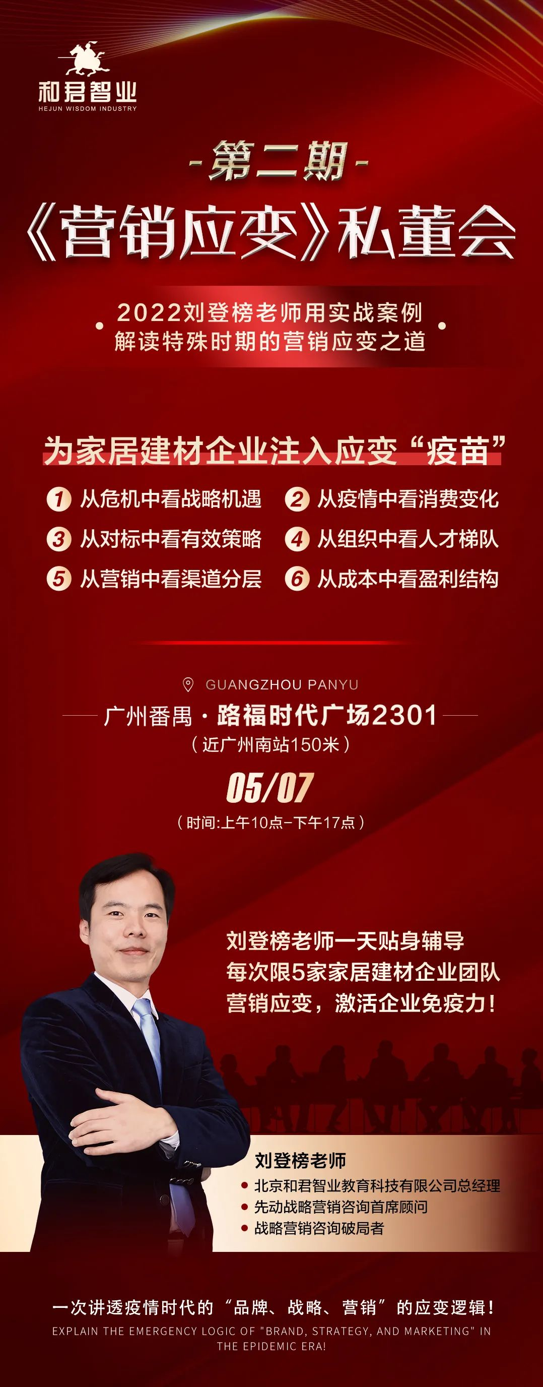 第一期《營銷應(yīng)變》私董會(huì)圓滿成功舉辦!感謝客戶的參與!歡迎大家參加5月7日第二期私董會(huì)交流學(xué)習(xí)!為家居建材行業(yè)助力前行! 劉登榜老師為家居建材企業(yè)注入應(yīng)變“疫苗” 1、從危機(jī)中看戰(zhàn)略機(jī)遇 2、從疫情中看消費(fèi)變化 3、從對(duì)標(biāo)中看有效策略 4、從組織中看人才梯隊(duì) 5、從營銷中看渠道分層 6、從成本中看盈利結(jié)構(gòu) 一天貼身實(shí)戰(zhàn)輔導(dǎo),限5家建材家居企業(yè)團(tuán)隊(duì),營銷應(yīng)變,激活企業(yè)免疫力! 時(shí)間:2022年5月7日 地點(diǎn):廣州南站路福聯(lián)合廣場(chǎng)23樓 先搶先得,精彩只為有準(zhǔn)備的您,歡迎咨詢