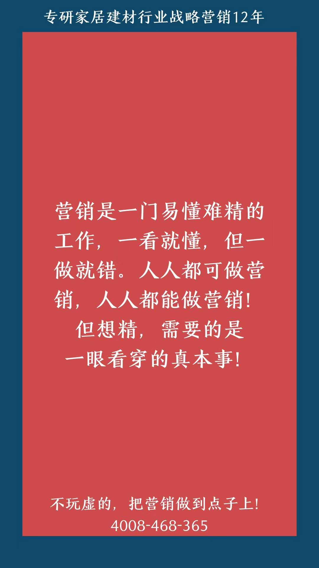 專注家居建材行業(yè)戰(zhàn)略營銷咨詢12年 北京和君智業(yè)教育科技有限公司總經(jīng)理 中國家居建材行業(yè)戰(zhàn)略營銷研究中心發(fā)起人 大商公司化運營專業(yè)顧問 資深實戰(zhàn)派講師 戰(zhàn)略營銷語錄:進門難! 營銷是一門易懂難精的工作,一看就懂,但一做就錯。 人人都可做營銷,人人都能做營銷! 但想精,需要的是一眼看穿的真本事!
