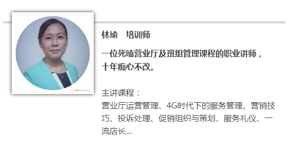 * 培訓師林瑜客戶服務營銷實戰(zhàn)派講師; * 16年專注于營業(yè)廳一線、裝維一線、客服一線,專注服務提升、投訴處理、銷售技巧、廳店運營、基層班組長課程,在這個領域里精耕細作,做專、做精,塑就市場與學員好口碑; * 累計為中國移動、中國聯(lián)通、中國電信多個省、市公司提供培訓超千場, 累計參訓人..