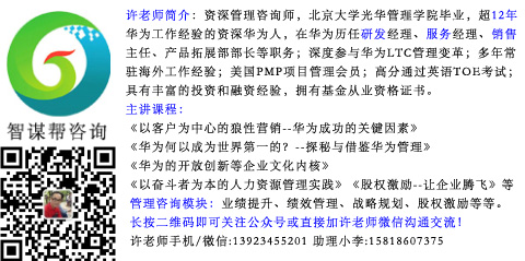 許浩明老師的簡單介紹: 1、北京大學(xué)光華管理學(xué)院畢業(yè)、近十三年華為管理實戰(zhàn)經(jīng)驗;北大光華碩士論文是《華為管理實踐》方面的課題,對華為管理進(jìn)行深入研究,而且有豐富華為管理實戰(zhàn)經(jīng)驗。 2、在華為三大核心體系都奮斗歷練過的前華為部長;曾在華為獲“華為金牌團(tuán)隊獎”&ldquo..