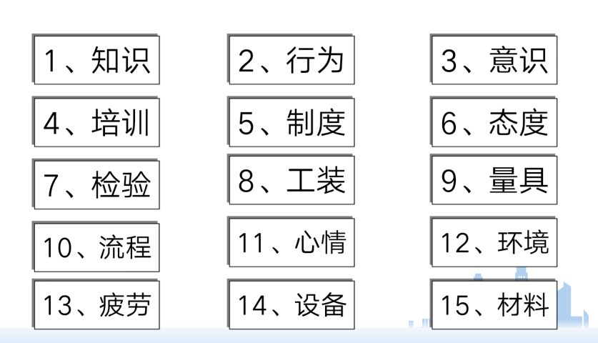 如果不能顯示圖片內容,則可閱讀以下等同圖片的詞語內容。 1、知識;2、行為;3、意識;4、培訓;5、制度;6、態(tài)度;7、檢驗;8、工裝;9、量具;10、流程;11、心情;12、環(huán)境;13、疲勞;14、設備;15、材料。 |