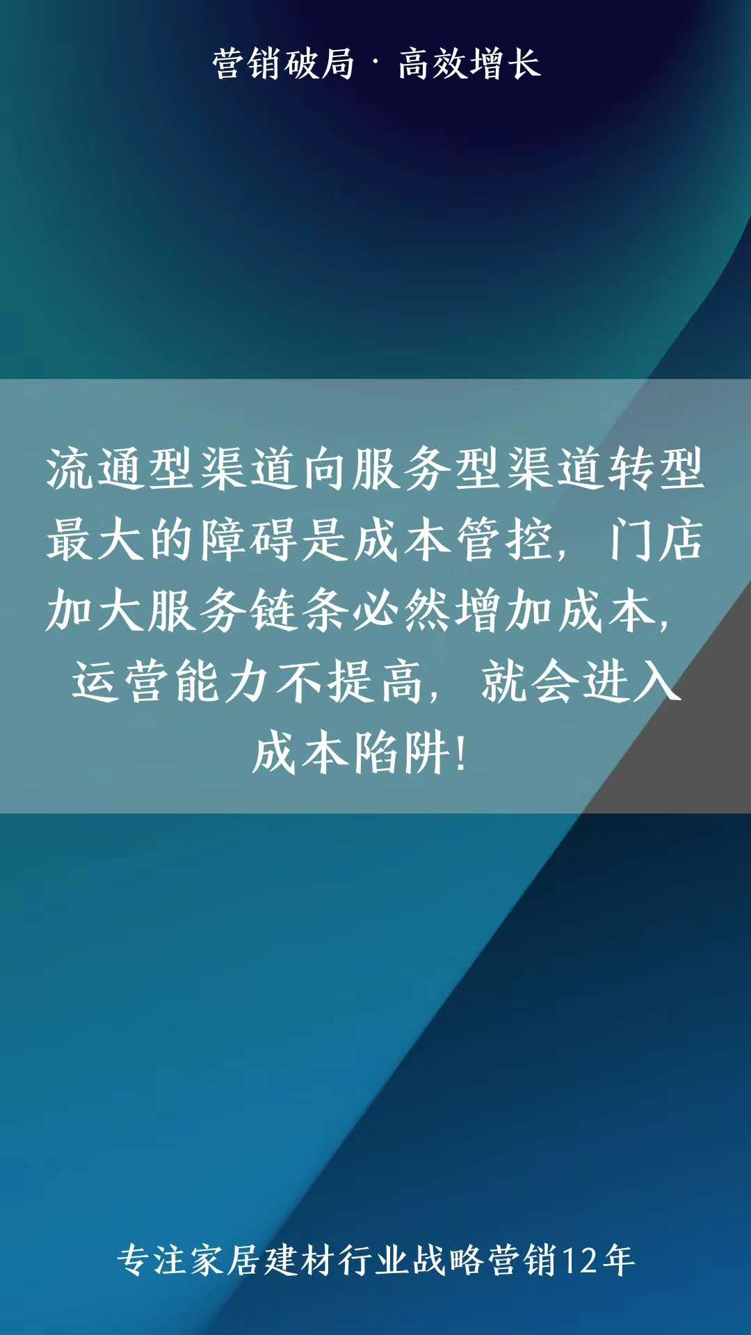 劉登榜 專注家居建材行業(yè)戰(zhàn)略營銷咨詢12年 北京和君智業(yè)教育科技有限公司總經理 中國家居建材行業(yè)戰(zhàn)略營銷研究中心發(fā)起人 大商公司化運營專業(yè)顧問 資深實戰(zhàn)派講師 戰(zhàn)略營銷語錄:成本陷阱! 流通型渠道向服務型渠道轉型最大的障礙是成本管控,門店加大服務鏈條必然增加成本,運營能力不提高,就會陷入成本陷阱!