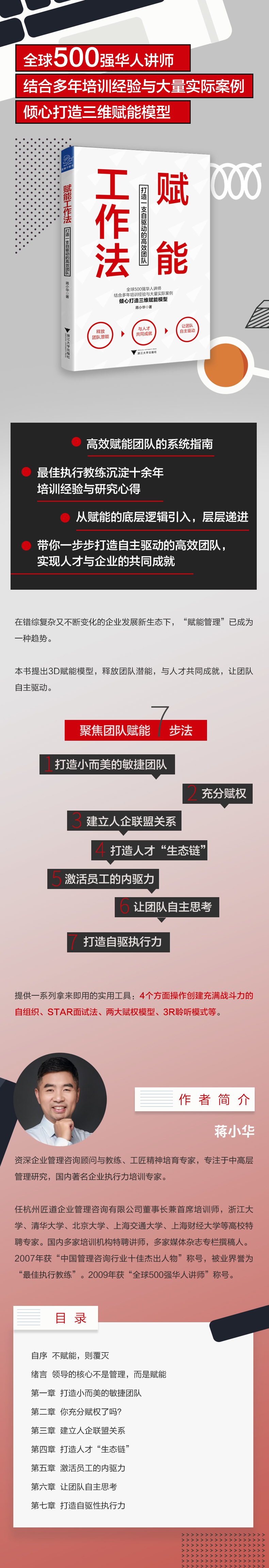 我曾問過無數(shù)的團(tuán)隊(duì)管理者,他們管理中的最大痛點(diǎn)是什么?結(jié)果收到的回答中最多的是,企業(yè)缺少優(yōu)秀的人才,員工缺乏足夠的能力和動力。 情況真是這樣嗎?我通過10 多年的企業(yè)管理研究和實(shí)踐,驚訝地發(fā)現(xiàn),企業(yè)并不是缺人才,而是缺乏管理人才的賦能力;員工也不是缺能力,而是缺乏釋放能力的驅(qū)動力。 正如任正非說,企業(yè)的核心競爭力不是人才,而是管理人才的能力。任正非所說的人才管理能力,其本質(zhì)就是對人才賦能。尤其是在不確定性因素很多的今天,這一點(diǎn)尤為明顯,甚至可以毫不夸張地說,“不賦能,則覆滅”。 阿里巴巴集團(tuán)學(xué)術(shù)委員會主席、湖畔大學(xué)教育長曾鳴也指出,未來企業(yè)的核心功能不是管理,而是賦能。在錯綜復(fù)雜的社會環(huán)境下,企業(yè)管理的關(guān)鍵已從控制命令式轉(zhuǎn)變?yōu)橘x能分布式。 何謂賦能?賦是賦予,能是權(quán)力、能力和動力,連起來就是賦予團(tuán)隊(duì)權(quán)力、動力和能力,讓團(tuán)隊(duì)自主決策和自主驅(qū)動。很多時候,企業(yè)一著慢,滿盤輸。正如普希爾定律所說:再好的決策也經(jīng)不起拖延。只有懂得賦能的組織或個人,才可能擁有強(qiáng)大的、能快速反應(yīng)的團(tuán)隊(duì)。 賦能的概念起源于20 世紀(jì)20 年代,提出者是被德魯克稱為“管理學(xué)的先知”,人稱“管理理論之母”的現(xiàn)代管理學(xué)理論預(yù)言家瑪麗·帕克·福萊特。她嚴(yán)厲地批判了等級森嚴(yán)的企業(yè)組織結(jié)構(gòu),非常反對“命令與控制”型的管理作風(fēng),倡導(dǎo)民主的管理方式,認(rèn)為決策時應(yīng)充分考慮基層員工的經(jīng)驗(yàn)和知識。 那時候,賦能對個體而言更多的是一種激勵,但激勵應(yīng)視作賦能在工業(yè)時代的前身,而賦能在信息時代是對激勵的升級和優(yōu)化,是激發(fā)員工的潛能,讓團(tuán)隊(duì)自主決策,以應(yīng)對外界的變化,且讓團(tuán)隊(duì)自我驅(qū)動,打造敏捷團(tuán)隊(duì)的最好的良方。 另外,賦能是要“創(chuàng)造”更多優(yōu)秀的人才,與人才共同成就。賦能領(lǐng)導(dǎo)者總是把精力投入到如何提取與延伸他人的才能之中,他們不炫耀自己的智力,不滿足于眼前的利益,而關(guān)注長遠(yuǎn)的發(fā)展。也就是說,他們從員工那里得到的比員工自己知道的還要多。 研究發(fā)現(xiàn),一般的領(lǐng)導(dǎo)者,只能讓員工發(fā)揮20%~50% 的能力,而賦能領(lǐng)導(dǎo)者通常能讓員工發(fā)揮70%~100% 的能力,這兩者相差約2倍。如果我們能得到現(xiàn)在團(tuán)隊(duì)雙倍的才能,那么還有什么做不到的目標(biāo)呢? 為什么賦能領(lǐng)導(dǎo)者可以挖掘出員工更多的能力?因?yàn)樗麄兿嘈艈T工很聰明,有能力解決問題,而且他們相信員工可以在更高的水平上做出貢獻(xiàn)。他們會不斷地問自己:這個人的優(yōu)點(diǎn)是什么?我可以做些什么能更好地發(fā)揮他的優(yōu)點(diǎn)呢? 《高效能人士的七個習(xí)慣》一書的作者史蒂芬·柯維說:“如果每一位領(lǐng)導(dǎo)者都從限制團(tuán)隊(duì)發(fā)展的領(lǐng)導(dǎo)向賦能領(lǐng)導(dǎo)者邁進(jìn)一步,社會將會如何變化呢?”目前,企業(yè)內(nèi)部有許多沒有挖掘的人力資源,相反還削弱了員工的智慧。 為此,我進(jìn)行了深入的探索和研究,試著整理出一個框架和體系,給讀者,特別是給從事團(tuán)隊(duì)工作的領(lǐng)導(dǎo)們提供一套“地圖”。 本書的緒言部分,主要闡述從傳統(tǒng)管理到領(lǐng)導(dǎo)賦能的思維轉(zhuǎn)變,并構(gòu)建釋放團(tuán)隊(duì)潛能、與人才共同成就和讓團(tuán)隊(duì)自主驅(qū)動的三維賦能模型。全書共分3 部分進(jìn)行系統(tǒng)闡述。 第一部分,主要闡述如何解放團(tuán)隊(duì)束縛,釋放團(tuán)隊(duì)潛能。一是從組織架構(gòu)上加以精簡和扁平化,并創(chuàng)造協(xié)同文化;二是從有效賦權(quán)的角度,放權(quán)釋能,從而打造一支小而美的敏捷團(tuán)隊(duì)。 第二部分,主要闡述如何讓團(tuán)隊(duì)與人才共同成就。該部分通過重新定義人與企業(yè)的關(guān)系、找到合適的人才、創(chuàng)造人才最大合力、穩(wěn)固聯(lián)盟關(guān)系、培養(yǎng)和打造卓越人才等,構(gòu)建相互成就的人才生態(tài)鏈。 第三部分,主要闡述如何讓團(tuán)隊(duì)自主驅(qū)動。該部分分別從激發(fā)團(tuán)隊(duì)的內(nèi)驅(qū)力、讓團(tuán)隊(duì)自主思考和打造自驅(qū)性執(zhí)行力的角度,提煉一套團(tuán)隊(duì)自驅(qū)體系。 可以說,這是一本關(guān)于團(tuán)隊(duì)賦能比較成體系的書,希望本書能給讀者梳理出賦能的框架和行動攻略,從而可以輕松地打造出一支自驅(qū)動的敏捷團(tuán)隊(duì)。