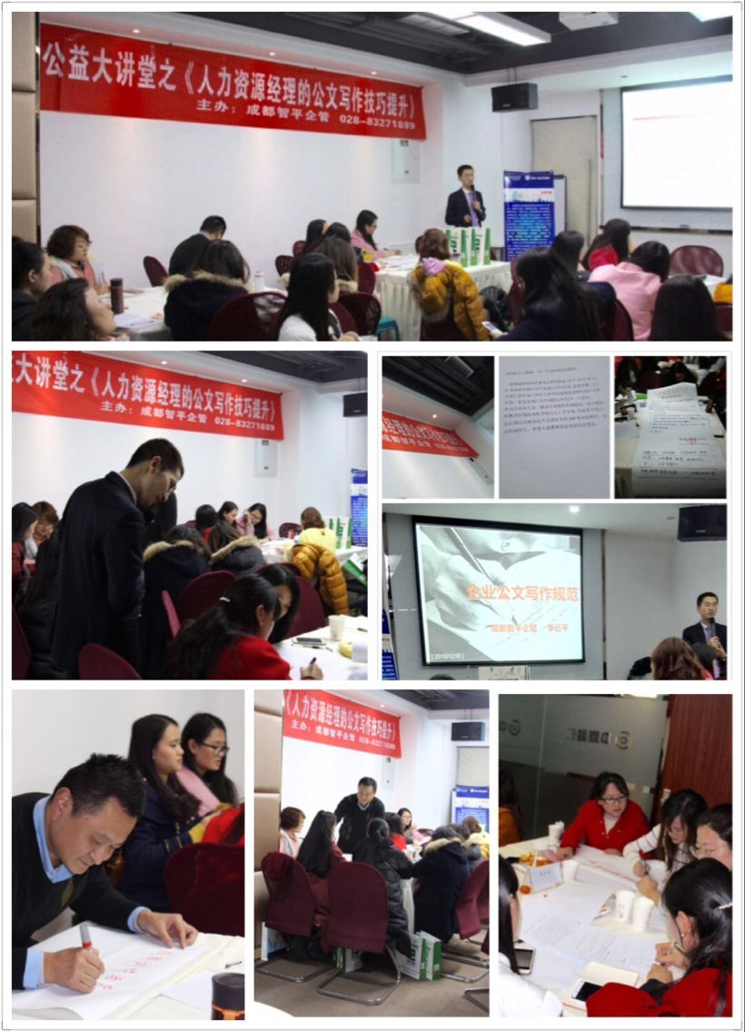 12月16日在成都舉辦公益大講堂關(guān)于《人力資源經(jīng)理的公文寫作規(guī)范與提升》,本課程為公益性的,但是還是有很多中大型企業(yè)報名參加,本次課程講師是李近平老師,在課程中老師和同學(xué)的互動很多也在課程中表現(xiàn)出活躍的氣氛。 |