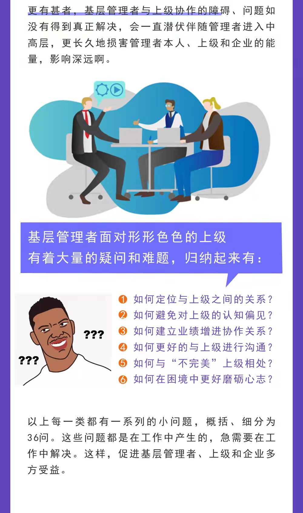 以上每一類都有一系列的小問題,概括、細(xì)分為36問。這些問題都是在工作中產(chǎn)生的,急需要在工作中解決。這樣,促進(jìn)基層管理者、上級和企業(yè)多方受益。