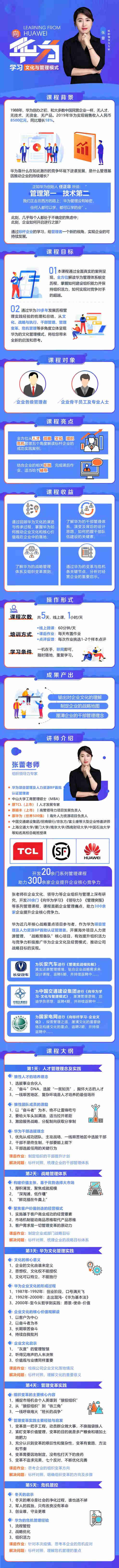 張老師在企業(yè)文化、領(lǐng)導(dǎo)力等企業(yè)組織與管理上深有研究,開發(fā)20余門《向華為學(xué)習(xí)》《領(lǐng)導(dǎo)力》《管理突圍》等系列管理課程,課程直戳企業(yè)管理痛點(diǎn),助力300余家企業(yè)提升企業(yè)核心競爭力。