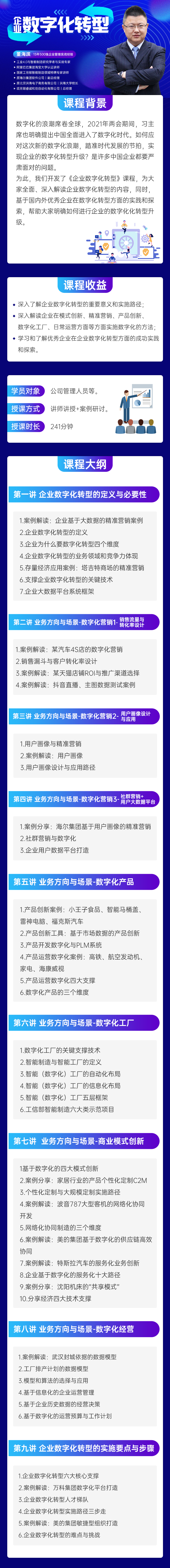 為此,我們開發(fā)了《企業(yè)數(shù)字化轉(zhuǎn)型》課程,為大家全面、深入解讀企業(yè)數(shù)字化轉(zhuǎn)型的內(nèi)容,同時,基于國內(nèi)外優(yōu)秀企業(yè)在數(shù)字化轉(zhuǎn)型方面的實踐和探索,幫助大家明確如何進行企業(yè)的數(shù)字化化轉(zhuǎn)型升級。