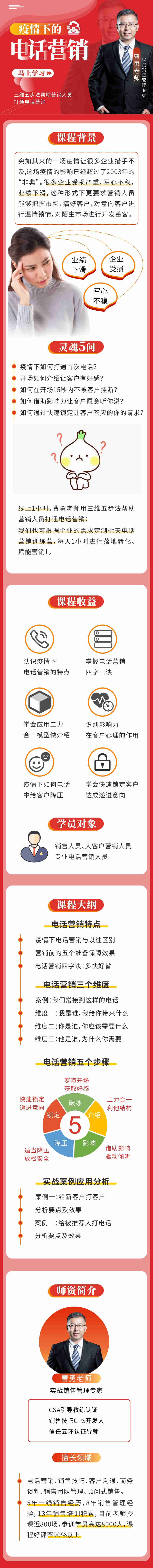 電話營銷、銷售技巧、客戶溝通、商務談判、銷售團隊管理、顧問式銷售。5年一線銷售經(jīng)歷,8年銷售管理經(jīng)驗,13年銷售培訓積累,目前老師授課近800場,參訓學員高達8000人,課程好評率9096以上