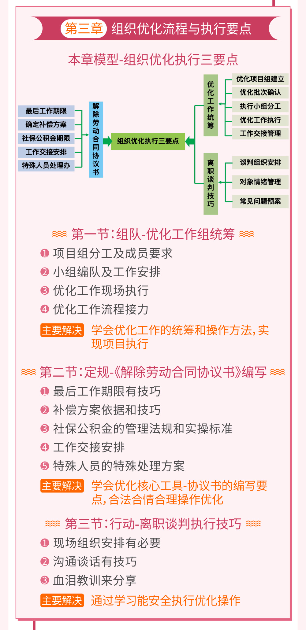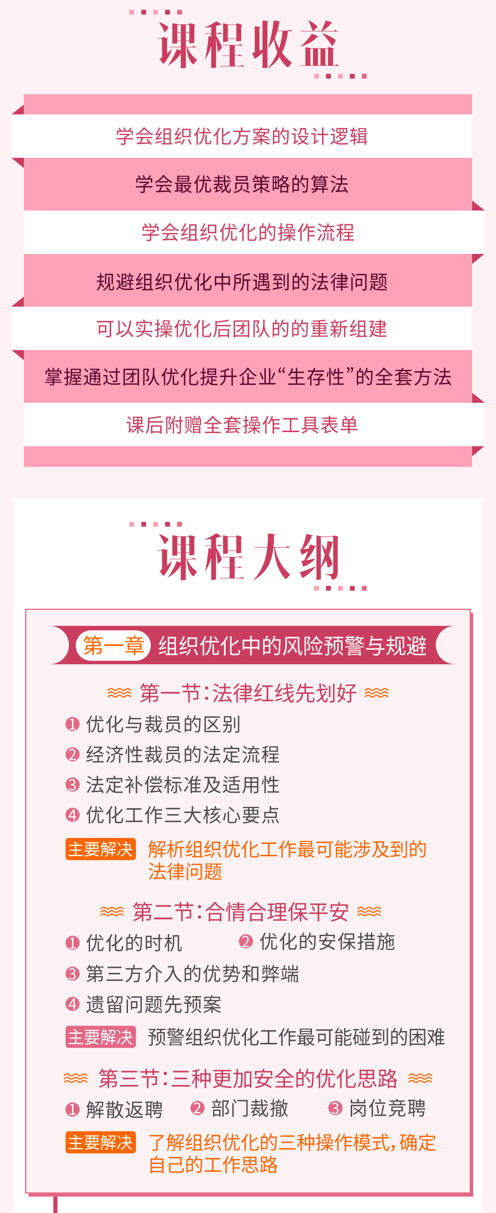 本課程分為上下兩個模塊,針對以上問題進(jìn)行逐個擊破,確保企業(yè)能夠安全、合理、合法的進(jìn)行組織優(yōu)化,幫助企業(yè)瘦身后再戰(zhàn)輝煌!