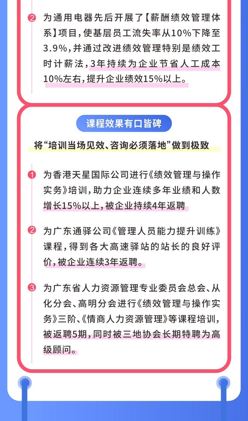 為香港天星國(guó)際公司進(jìn)行《績(jī)效管理與操作實(shí)務(wù)》培訓(xùn),助力企業(yè)連續(xù)多年業(yè)績(jī)和人數(shù)增長(zhǎng)15%以上,被企業(yè)持續(xù)4年返聘。