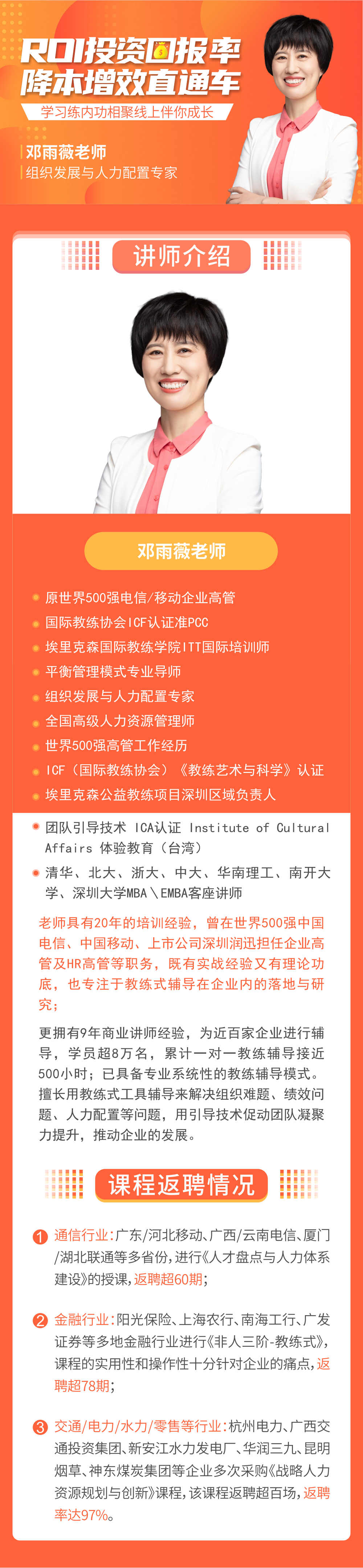 老師具有20年的培訓經(jīng)驗,曾在世界500強中國電信、中國移動、上市公司深圳潤迅擔任企業(yè)高管及HR高管等職務,既有實戰(zhàn)經(jīng)驗又有理論功底,也專注于教練式輔導在企業(yè)內的落地與研究;