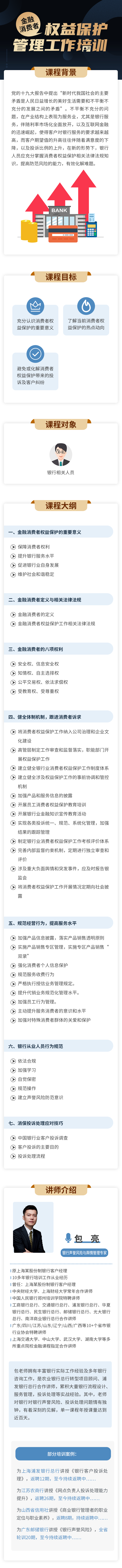 包老師擁有豐富銀行實際工作經(jīng)驗及多年銀行咨詢工作,是農(nóng)業(yè)銀行總行轉(zhuǎn)型項目顧問、浦發(fā)銀行總行合作講師,累積大量銀行流程設計、服務管理,投訴處理等實戰(zhàn)經(jīng)驗。其中,老師對銀行對銀行聲譽風險、投訴處理問題情有獨鐘,有著深刻的見解,單一課程年授課量達到近百天。