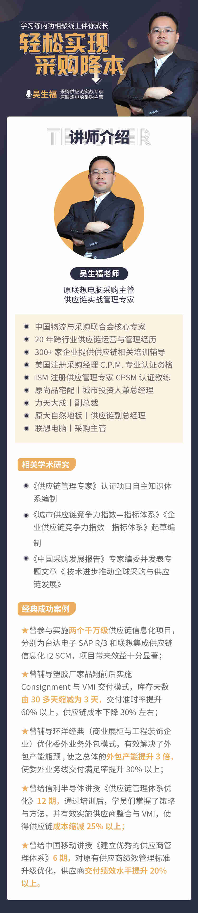 ★曾給中國(guó)移動(dòng)講授《建立優(yōu)秀的供應(yīng)商管理體系》6 期,對(duì)原有供應(yīng)商績(jī)效管理標(biāo)準(zhǔn)升級(jí)優(yōu)化,供應(yīng)商交付績(jī)效水平提升 20%以上。