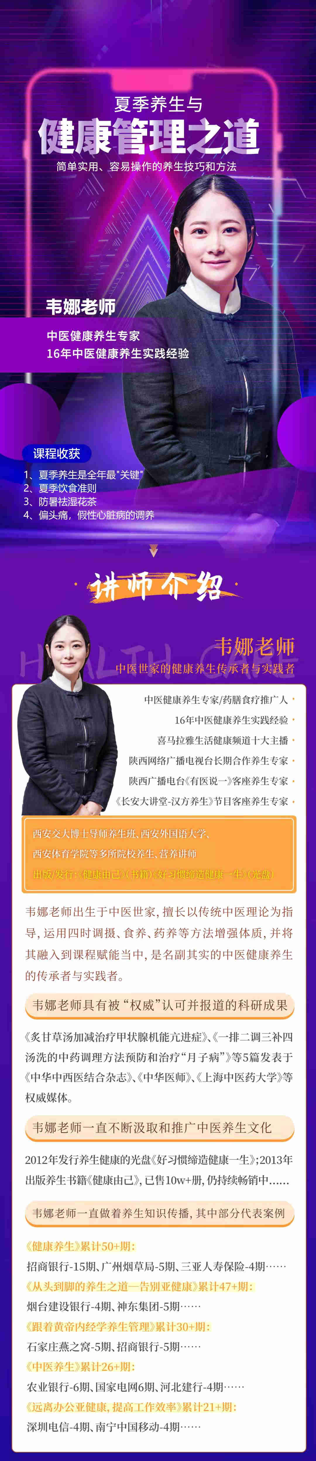 韋娜老師出生于中醫(yī)世家,擅長(zhǎng)以傳統(tǒng)中醫(yī)理論為指導(dǎo),運(yùn)用四時(shí)調(diào)攝、食養(yǎng)、藥養(yǎng)等方法增強(qiáng)體質(zhì),并將其勝入到課程賦能當(dāng)中,是名副其實(shí)的中醫(yī)健康養(yǎng)生的傳承者與實(shí)踐者。