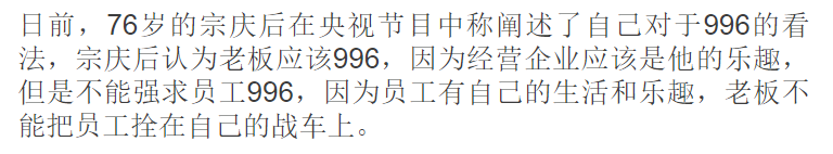 近日,在央視一檔節(jié)目里,宗慶后對于996問題相關(guān)的發(fā)言在互聯(lián)網(wǎng)上火了。