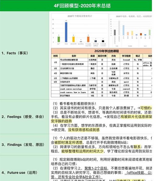 簡單來說,用4F回顧法,可以明確知道在一段時間內(nèi),我做了什么(facts),做這些事情的感受(feeling),為什么會有這樣的感受或者做這些事情的原因(findings),最后得出可以用在之后的工作、生活的啟示(future use)。