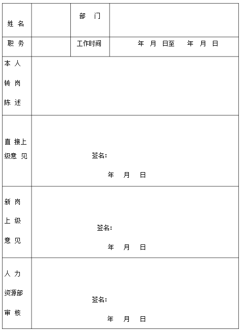 員工在任何時(shí)候都可以提出轉(zhuǎn)崗申請(qǐng) ,具體見附則中的轉(zhuǎn)崗申請(qǐng)表。