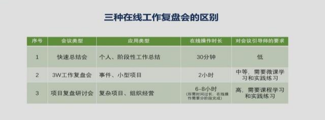 相比較快速總結會和項目復盤研討會而言,3W工作復盤更加適合事件和小型項目,不會過于簡單,也不會過于復雜。